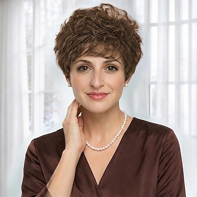 Peruca pixie curta e encaracolada chique para mulheres - castanho suave com volume natural
