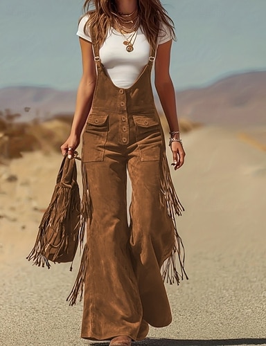 Mulheres Calças Cargo Perna larga Calças justas macacão Moda Roupa de rua Casual Comprimento total Cintura Alta Tecido Franjas Bolsos Confortável Sem Elasticidade Ao ar livre Férias Rua Preto