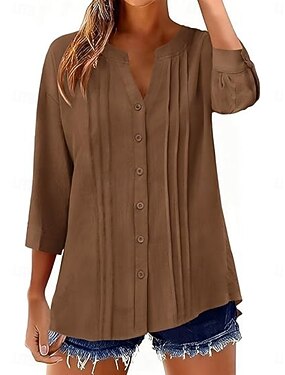 Mulheres Mistura de Algodão Blusa Botões Tecido Básico Moderno Manga 3/4 Decote V Tops regulares Diário Feriado Para Noite Preto Branco Rosa Marron Damasco Verão