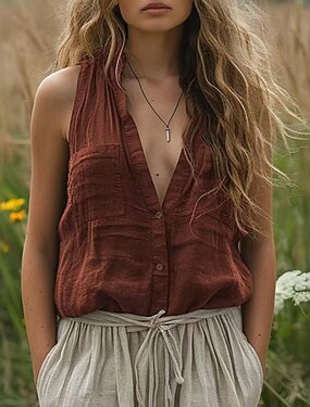 Mulheres Blusa Linho de algodão sintético Bolsos Botões Tecido à moda Sem Manga Decote V Tops regulares Feriado Para Noite Branco Marron Cinzento Verão