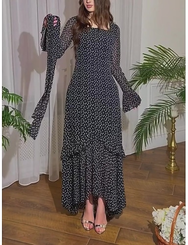 Mulheres Vestido Longo Vestido A Line Casual Diário Normal Poá Manga Longa Decote Quadrado Preto Primavera Outono