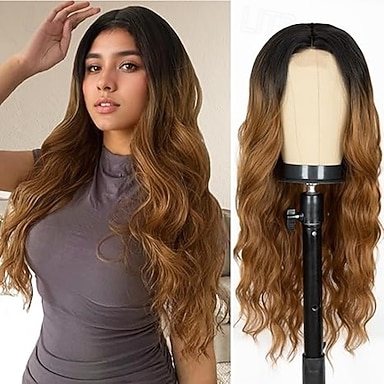 perucas longas e onduladas para mulheres, parte do meio, raízes escuras, cabelo ondulado, peruca frontal natural, cabelo sintético cacheado em camadas, para halloween, natal, cosplay, festa, namoro