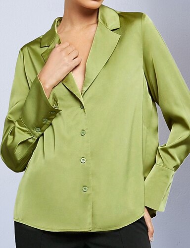 Mulheres Camisa Social Blusa de cetim Saia camisa de botão Côr Sólida Tecido Elegante Moda Casual Manga Curta Manga Longa Colarinho Chinês Tops regulares Streetwear Escritório Trabalho Verde Claro