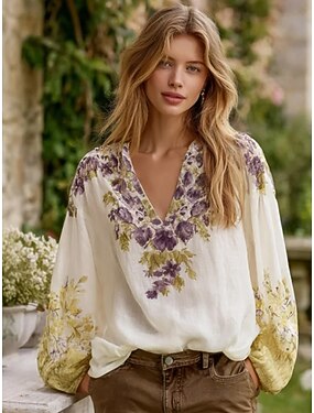 Blusa Boho Feminina Semelhante a Linho Respirável Leve Floral Elegante Boêmia Vintage Manga Longa Gola V Tops Regulares Diários Feriado Estampa em Patches Azul Verde Esmaecido Verão Primavera