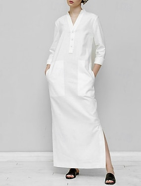 Mulheres Vestido Longo Vestido Maxi Linho de algodão sintético Vestido de turno Vestido casual Elegante Moda Moderno Diário Férias Para Noite Ajuste Largo Tecido Manga Longa Decote V Preto Branco