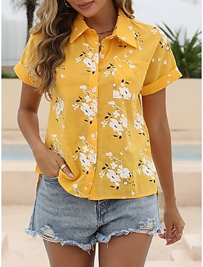 Mulheres Camisa Social Blusa Linho de algodão sintético Patchwork Botões Imprimir Floral Gráfico Vintage à moda Clássico Manga Curta Colarinho de Camisa Tops regulares Diário Feriado Para Noite
