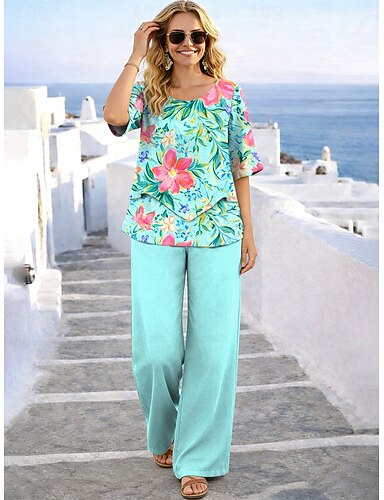Mulheres Conjuntos de calças Meia Manga Decote Redondo Floral Gráfico Elegante Férias Casual Diário Férias Azul Amarelo Roxo Verão Normal