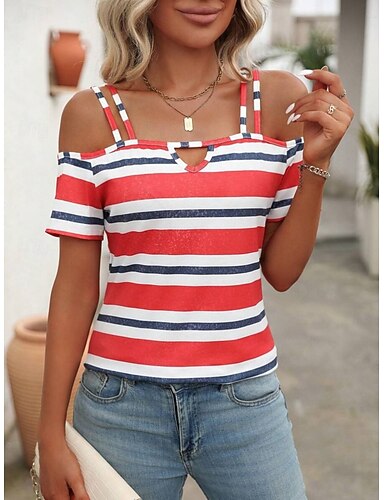 Mulheres Camiseta T-shirt Patchwork Imprimir Listrado Moda à moda Casual Manga Curta Ombro a Ombro Tops regulares Diário Para Noite Final de semana Azul Vermelho Verão Primavera