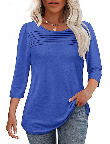 Mulheres Camisa Social Mistura de Algodão Blusa Patchwork Côr Sólida à moda Casual Manga 3/4 Gola Redonda Tops regulares Diário Trabalho Para Noite Azul Amarelo Rosa Cinzento Verão Primavera