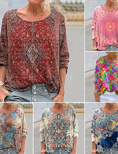 Mulheres camisa Boho Blusa Patchwork Imprimir Gráfico Vintage à moda Clássico Manga Longa Gola Redonda Tops regulares Diário Feriado Para Noite Rosa Vinho Azul Marinha Cáqui Rosa cor de Rosa