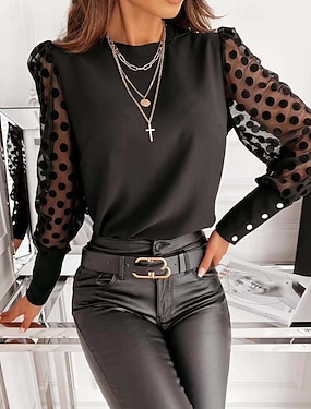 Mulheres Blusa Patchwork Com Transparência Poá Ativo à moda Manga Longa Gola Redonda Tops regulares Feriado Para Noite Preto Branco Verão Primavera