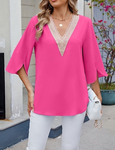 Mulheres Tops de verão Blusa Tops elegantes Franzido Renda Patchwork Côr Sólida Tecido Elegante Vintage Diário Manga 3/4 Decote V Tops regulares Diário Trabalho Feriado Branco Verão Primavera