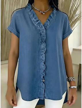 Mulheres Camisa Social Blusa Blusa com babados Patchwork Botões Tecido à moda Clássico Moderno Manga Curta Decote V Tops regulares Diário Feriado Para Noite Preto Azul Escuro Azul Claro Verão