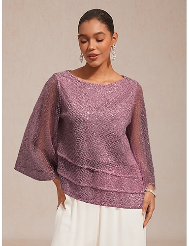 Mulheres Blusa Tops de renda Paetês Patchwork Transparente Côr Sólida Elegante à moda Básico Manga 3/4 Sino Gola Redonda Decote Canoa Tops longos Diário Convidado do casamento Roupas de férias Roxo