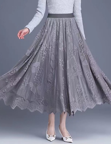 Mulheres Saia Balanço Moda Longo Cintura Média Saias Tecido Renda Patchwork Micro-Elástica Férias Rua Cáqui Outono Poliéster