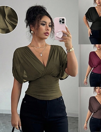 Mulheres Blusa Côr Sólida Tecido Elegante Vintage Moda Manga Curta Decote V Decote mergulhador Tops regulares clarete Café marrom Preto Verde Tropa Verão Primavera