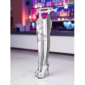 botas femininas prateadas de salto alto acima do joelho com zíper - elegantes e brilhantes para festas e moda