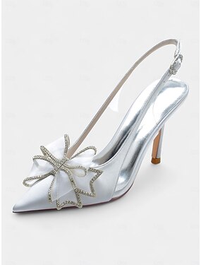 Sapatos de noiva elegantes em cetim com laço de cristal – sapatos de salto alto com tira no calcanhar para casamentos clássicos em salões de baile e cerimônias mais íntimas.