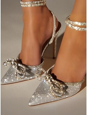 Sapatos de salto alto rosa com glitter e laço de strass para mulheres – sapatos românticos para festas de Dia dos Namorados, scarpins brilhantes com tira no tornozelo para encontros românticos e