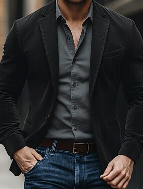 Blazer masculino em jeans com gola entalhada, estilo retrô vintage, casual, para uso externo, cor sólida preta ou cinza, corte ajustado, abotoamento simples com dois botões.