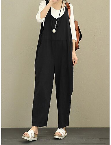 Macacão Normal de Linho Falso como Algodão para Mulheres Ativo Gráfico Sem Mangas Larga Gola Redonda com Cordão com Bolso Para o Dia a Dia Férias Ajuste Solto Preto Branco Verde Verão