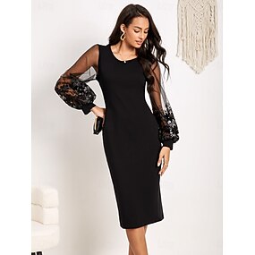 Mulheres Comprimento do chá Vestido preto Vestido de renda Vestido Coquetel Vestido formal Elegante Festa Natal Tecido Manga Longa Gola Redonda Preto Primavera Outono Inverno