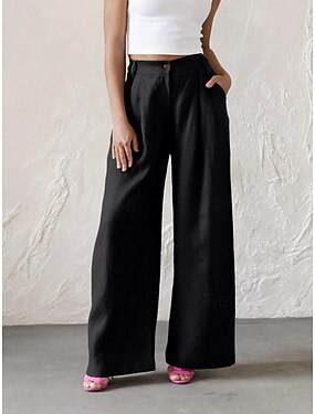 Mulheres Calças de linho de algodão Perna larga Calça casual Calça verão Férias Roupa de rua Básico Comprimento total Cintura Alta Tecido Bolsos Confortável Conforto Respirável Sem Elasticidade