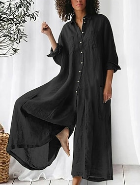 Vestido Maxi de Algodão e Linho Feminino Vestido Shift Casual Diariamente Solto Liso Manga Longa Lapela Azul Preto Branco Verde Claro Verão Primavera Outono