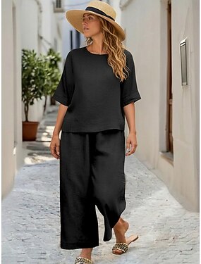 Mulheres Conjuntos de linho de algodão Conjuntos de calças Meia Manga Decote Redondo Tecido Franzido Ativo Roupa de rua Diário Ao ar livre Férias Preto Branco Verde Tropa Verão Ajuste Largo