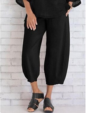Calça feminina de verão 100% algodão, estilo harém, confortável, comprimento até o tornozelo, cor lisa natural, com bolso, cintura elástica, casual, nas cores preto, branco, verde militar e azul marinho escuro. Ideal para verão, primavera e outono.