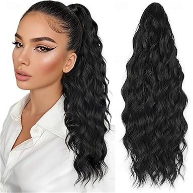 Extensão de rabo de cavalo com cordão, rabo de cavalo sintético longo e ondulado em camadas, aplique de cabelo preto natural para mulheres, 50 cm x 50 cm