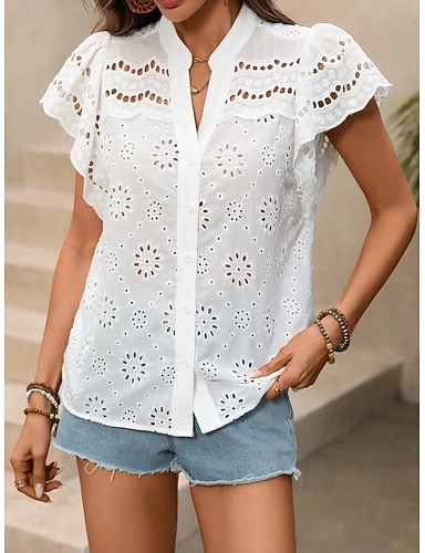 Mulheres Blusa Ilhó Côr Sólida Elegante Diário à moda Manga Curta Decote V Tops regulares Diário Branco Verão Primavera