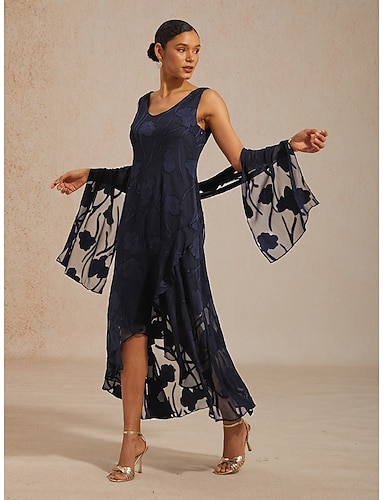 Mulheres Comprimento do chá Vestido de chiffon Elegante Manga Flare Férias Diário Encontro Normal Floral Manga Curta Decote V Azul Escuro Verão