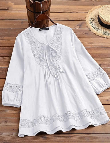 Mulheres Tops de verão Blusa Tops elegantes Franzido Renda Patchwork Côr Sólida Tecido Elegante Vintage Diário Manga 3/4 Decote V Tops regulares Diário Trabalho Feriado Branco Verão Primavera