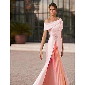 Sereia Longo Vestidos de baile Vestidos de noite Vestido de Baile Vestido formal Elegante Bloco de Cor Manga Curta Assimétrico Formal Casamento Vestido champanhe para mãe da noiva Cetim com Fenda