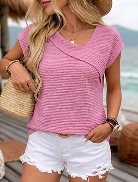 Mulheres Camiseta T-shirt Moda à moda Clássico Manga Curta Decote V Tops regulares Diário Para Noite Final de semana Preto Branco Rosa Damasco Verão Primavera