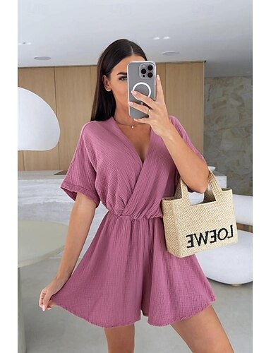 Mulheres Macacão Casual Côr Sólida Meia Manga Camiseta Decote V Cintura elástica Cintura Alta Diário Normal Preto Branco Rosa Verão