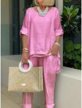 Mulheres Conjuntos de linho de algodão Conjuntos de duas peças Conjuntos de calças Manga Longa Colarinho Chinês Tecido Moda Roupa de rua Roupa Diária Encontro Branco Amarelo Rosa Verão Normal