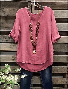 Mulheres Blusa Camisa de linho sintético Côr Sólida à moda Casual Manga 3/4 Gola Redonda Tops regulares Diário Azul Rosa Damasco Cinzento Verão Primavera Outono