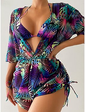 Mulheres Roupa de Banho Biquíni Três Peças Cavado roupa de banho Delgado Frente Única Férias Roupa de Praia Floral Gráfico Mergulho Sem Manga Fatos de banho