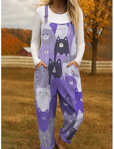 Womens Dungarees 100% Algodão Ativo Animal Sem Mangas Pernas Largas Decote Quadrado Com Bolso Férias Diário Ajuste Solto Branco Amarelo Roxo Verão