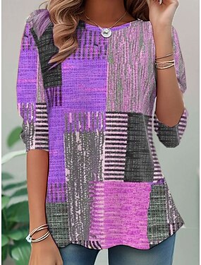 Camiseta Feminina Manga Longa Decote Redondo Longa Túnica Gráfica Geométrica Xadrez Casual Redondo Típicos Diários Impressão Rosa Roxo Verde Primavera Outono Pré-outono