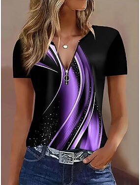 Mulheres Camiseta Zíper Âmbar Gráfico à moda Clássico Casual Manga Curta Gola Redonda Tops longos Diário Esportes Final de semana Azul Amarelo Rosa Roxo Verde Verão Primavera