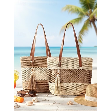 Bolsa feminina de palha trançada, grande capacidade com pingente de tassel, várias cores, bolsa elegante e casual para praia e viagens, ideal para o dia a dia.