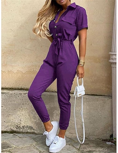 Mulheres Normal Macacão Roupa de rua Côr Sólida Manga Curta Colarinho de Camisa Botões Férias Diário Normal Rosa Vinho Azul Marinha Verão