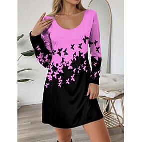 Vestido Mini Feminino Gola Redonda Manga Longa Vestido T Shirt Vestido Tee Vestido A Linha Vestido Casual Diário Ajuste Regular Gráfico Borboleta Branco Rosa Azul Roxo Outono Inverno