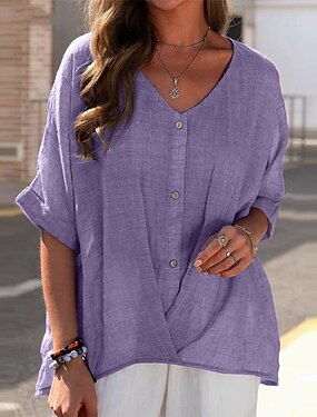 Mulheres Camisa Social Blusa Linho de algodão sintético Botões Tecido Casual Manga Curta Decote V Tops regulares Diário Azul Rosa Roxo Verde Cáqui Verão