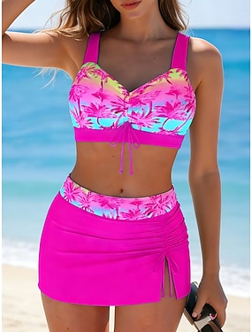 Womens biquíni 2 peças traje de banho saia de palmeira férias moda gráfico floral decote em V sem mangas