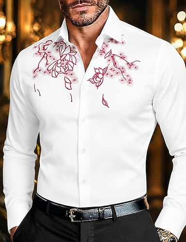 Homens Camisa Social Saia camisa de botão Camisa Bordada Floral Formal Casamento Preto Branco Manga Longa Lapela Verão Primavera Roupa Bordado