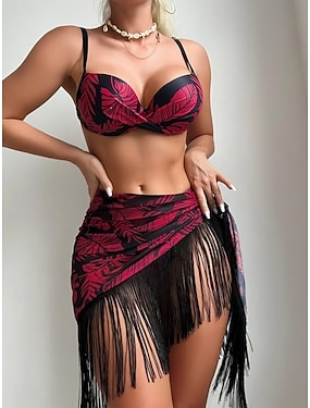 Mulheres Roupa de Banho Biquíni Três Peças Saia roupa de banho Delgado Frente Única Férias Tropical Floral Decote V Sem Manga Fatos de banho